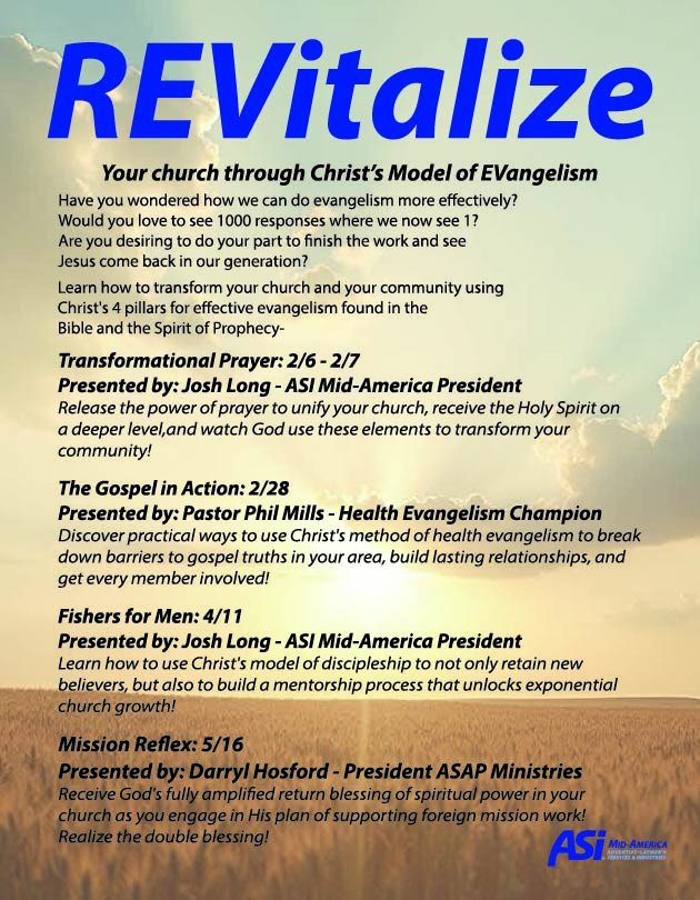 Lee’s Summit SDA Church is proud to host the inaugural REVitalize series in partnership with ASI Mid-America. Discover a practical roadmap for church transformation built on Christ’s four strategic pillars of evangelism
